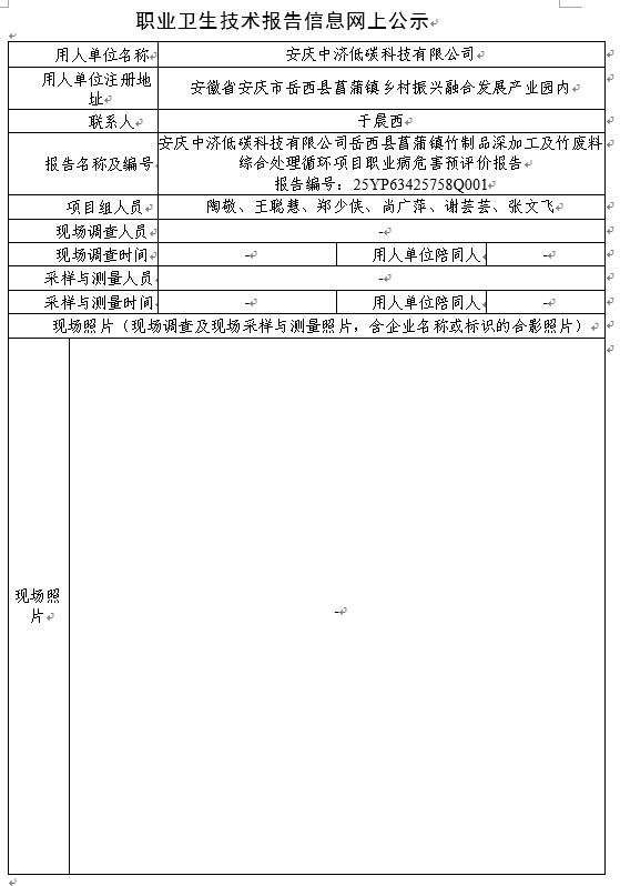 安慶中濟低碳科技有限公司岳西縣菖蒲鎮竹制品深加工及竹廢料綜合處理循環項目職業病危害預評價報告( 報告編號:25YP63425758Q001)