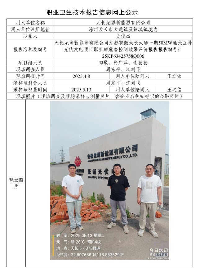 天長龍源新能源有限公司龍源安徽天長大通一期50MW漁光互補光伏發電項目職業病危害控制效果評價報告報告編號:25KP63425758Q006