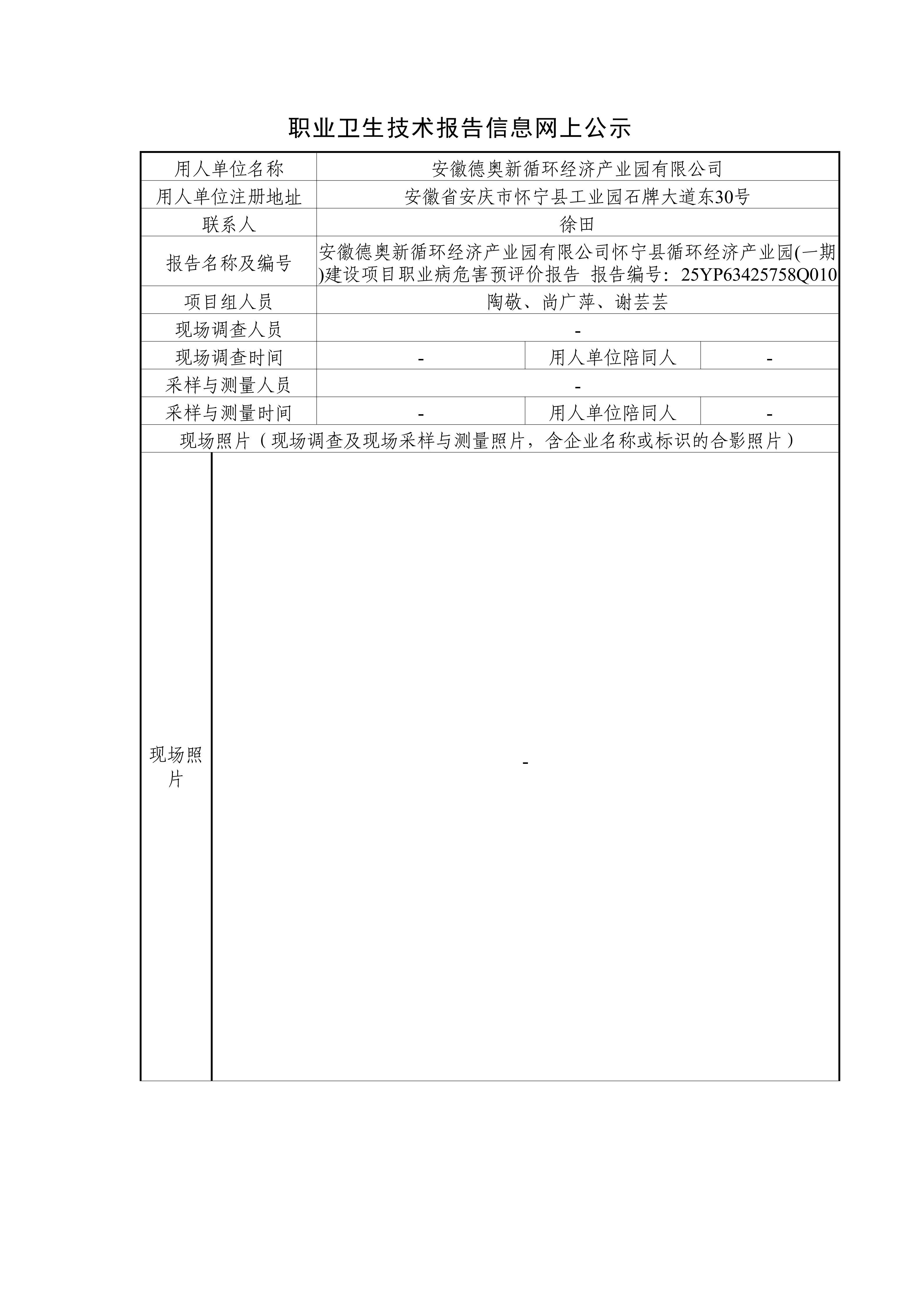 安徽德奧新循環經濟產業園有限公司懷寧縣循環經濟產業園(一期)建設項目職業病危害預評價報告 報告編號:25YP63425758Q010