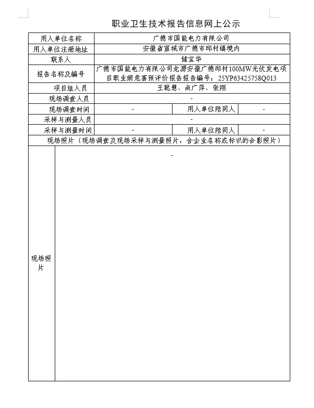 廣德市國能電力有限公司龍?jiān)窗不諒V德邱村100MW光伏發(fā)電項(xiàng)目 職業(yè)病危害預(yù)評(píng)價(jià)報(bào)告報(bào)告編號(hào):25YP63425758Q013